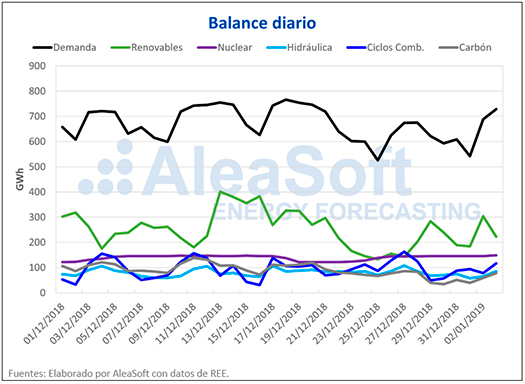 Es especialmente llamativo el precio registrado para el 1 de enero, 63,45 €/MWh, que fue el precio más caro entre los mercados europeos ese día, justo cuando el mercado alemán registraba un precio negativo de -4,30 €/MWh como promedio de las 24 horas del día. La baja producción eólica en la península el primer día del año no pudo compensar una de las demandas más bajas del invierno y disparó el precio un día que acostumbra a ser uno de los más bajos del año.