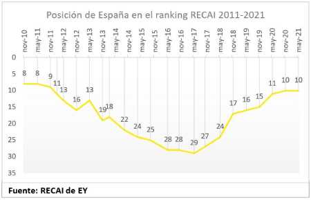 “Entre las causas esenciales que explican la progresiva mejora del mercado español en el índice RECAI desde 2017 destacaría la mayor certidumbre regulatoria y una clara planificación energética a medio plazo y, en particular, los ambiciosos objetivos que ha consagrado la nueva Ley de Cambio Climático (LCC) y el Plan Nacional Integrado de Energía y Clima (PNIEC) a 2030. "La incorporación de en torno a 60 GW de energías renovables hasta 2030, los ambiciosos objetivos incluidos en las hojas de ruta del almacenamiento e hidrógeno verde, junto con los nuevos mecanismos retributivos aprobados, estarían detrás de este interés”, explica Antonio Hernández, socio de Sectores Regulados y Análisis Económico de EY.