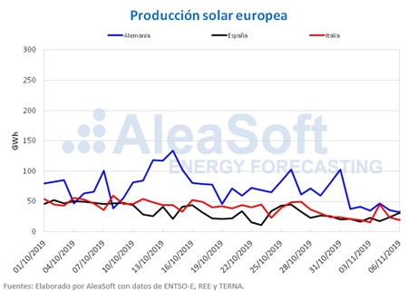 En el inicio de noviembre la producción solar ha tenido un buen comportamiento tanto en Italia como en España respecto a los seis primeros días de noviembre de 2018, con aumentos del 35% y 17% respectivamente. Por otro lado, Alemania ha registrado un 23% menos de producción solar interanual en el mismo período.