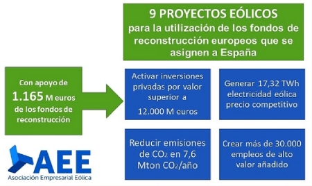 La propuesta de AEE incluye nueve proyectos tractores a escala nacional que, con un apoyo de 1.165 millones de euros de los fondos de reconstrucción, permitirían activar inversiones privadas por más de 12.000 millones de euros, generar 17,32 TWh de electricidad eólica (equivalente al 30% del incremento de generación eólica previsto en el PNIEC), reducir las emisiones de CO2 en más de 7,6 M Toneladas de CO2/año (el 7,5% de la reducción de emisiones previsto en el PNIEC) con un coste de incentivo por tonelada de CO2 reducido de 6 € ton/CO2. (Siendo el coste actual 27 €/tonCO2, y el previsto en 2030: 42 €/tonCO2), y crear más de 30.000 empleos de alto valor añadido.