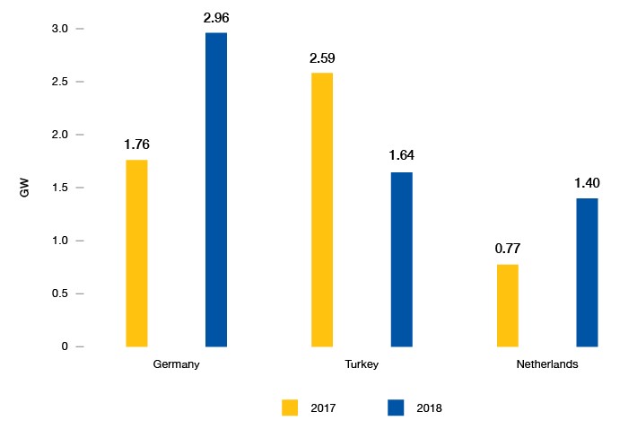 El mercado europeo que más solar instaló en 2018 fue Alemania, con 2,96 GW de nueva potencia conectada a red, un 68% más que los 1,76 GW instalados en 2017. Le siguió Turquía, el mercado solar europeo más importante del año anterior, que instaló 1,64 GW en 2018, un 37% menos que el año anterior, tras un descenso de la demanda debido a la crisis financiera del país. Una estrella solar en ascenso, los Países Bajos, se colocan como el tercer mercado solar más grande en 2018. El país añadió alrededor de 1,4 GW en comparación con 0,77 GW en 2017 y ahora está entrando por primera vez en el "club de gigavatios solares".