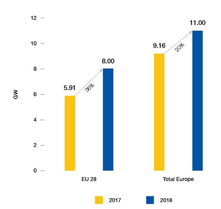 La Unión Europea instaló alrededor de 8 GW de sistemas de energía solar en 2018, lo que supone un incremento interanual del 36% respecto a los 5,9 GW conectados a la red en EU-28 en 2017, según una estimación de SolarPower Europe, la asociación para el sector de la energía solar en Europa. Las instalaciones solares en Europa en su conjunto crecieron alrededor de un 20% hasta alcanzar los 11,0 GW en 2018, frente a los 9,2 GW del año anterior.