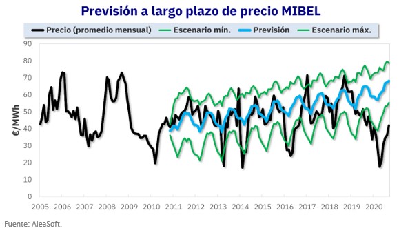 En el siguiente gráfico se puede observar una previsión de precios del mercado ibérico de electricidad MIBEL realizada por AleaSoft en octubre de 2010, hace 10 años. La previsión proyecta con precisión el precio de equilibrio del mercado en el futuro y las bandas de confianza describen las oscilaciones de los precios alrededor de éste con una métrica probabilística.