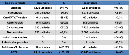 A pesar de la crisis del coronavirus, las matriculaciones de vehículos eléctricos puros de todo tipo (turismos, dos ruedas, comerciales e industriales) cerraron 2020 con un total de 35.045 unidades, lo que supone un 44,4% más. Según datos de la Asociación Empresarial para el Desarrollo e Impulso de la Movilidad Eléctrica (AEDIVE) y la Asociación Nacional de Vendedores de Vehículos a Motor, Reparación y Recambios (GANVAM), la movilidad eléctrica se incrementó un 127% en diciembre, hasta alcanzar las 5.411 unidades matriculadas.