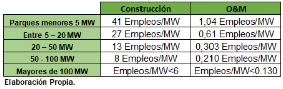 Si la totalidad de las nuevas instalaciones fueran de más de 100 MW, y lo más probable es que, efectivamente, la mayoría de la potencia se encuentre en esta situación, tendríamos que los 20.000 MW previstos generarían 120.000 puestos de trabajo en la construcción, empleo coyuntural durante dos años, y 2.600 puestos de trabajo fijos en la operación y el mantenimiento (O&M), que sería empleo estable durante, al menos, 30 años de vida útil estimada de estas instalaciones. Mientras que, si los parques fueran, en el otro extremo, de menos de 5 MW, tendríamos 820.000 empleos en los dos años de construcción y 20.800 empleos fijos en operación y mantenimiento.