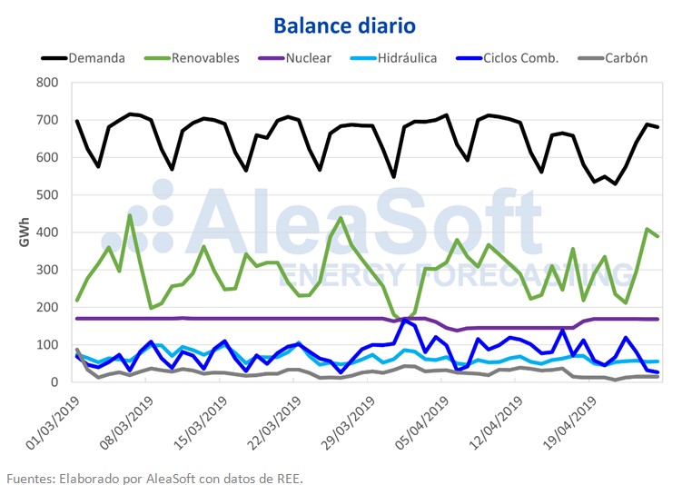 Durante la Semana Santa, del lunes 15 al domingo 21 de abril, la demanda de electricidad cayó un 11%, principalmente debido a las festividades asociadas a la Semana Santa y ayudado por un aumento de la temperatura media de 1,1 °C. Para esta semana del 22 de abril, con el lunes aun festivo en algunas comunidades, se espera una recuperación de la demanda con un aumento del 6,2% por la vuelta a la normalidad laboral y también por una bajada de las temperaturas de 1,1 °C en promedio.