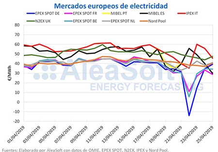 Todos los mercados europeos han disminuido los precios en lo que va de semana al ser comparados con los de los primeros cuatro días de la semana pasada. Las bajadas van desde el 7% del mercado EPEX SPOT de los Países Bajos, hasta el 55% del mercado EPEX SPOT de Alemania. En estas caídas han tenido una gran influencia los precios del lunes de Pascua, 22 de abril, cuando se alcanzaron precios negativos en los mercados de Alemania, Francia y Bélgica.