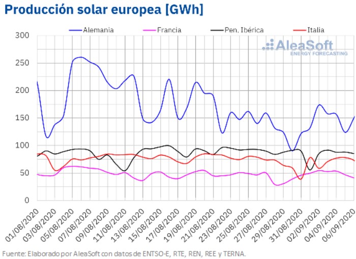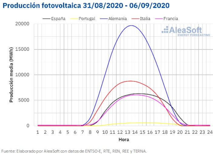 Durante la primera semana de septiembre la producción solar disminuyó un 7,7% en el mercado español, un 5,8% en el mercado italiano y un 4,3% en el mercado portugués, respecto a lo producido en la semana del 24 de agosto. Por el contrario, en el mercado francés aumentó un 16% y en el alemán un 6,4%.