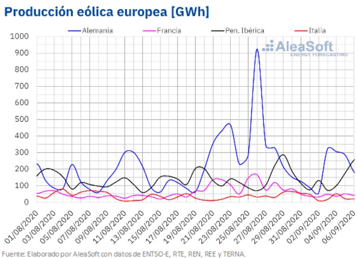 Durante la semana que comenzó el 31 de agosto, la producción eólica disminuyó en todos los mercados analizados en AleaSoft en comparación con la semana anterior. En los mercados de Francia y Portugal los descensos fueron de un 58% y un 52% respectivamente. En el mercado alemán la producción disminuyó un 45% y en el mercado italiano un 26%. La menor variación se registró en el mercado español y fue de un -1,6%.