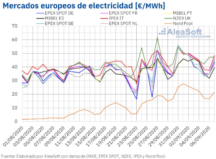 Los primeros días de la semana del 31 de agosto, los precios de los mercados eléctricos estuvieron muy acoplados, excepto los de los mercados MIBEL y Nord Pool, que fueron inferiores. En cambio, los últimos días de la semana, el comportamiento del mercado británico también se separó de la tendencia general del resto de los mercados, siendo el único mercado que mantuvo precios diarios superiores a 40 €/MWh.