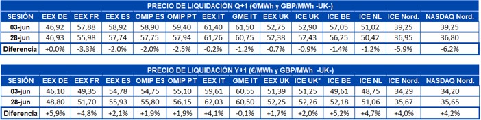 Durante el mes de junio se ha producido una bajada generalizada del precio de los futuros de electricidad europeos para el cuarto trimestre de 2019, exceptuando los futuros de Alemania en el mercado EEX que se mantuvieron prácticamente invariables entre el inicio y el final del mes. Las bajadas más importantes se han registrado para los futuros de los países nórdicos en los mercados ICE y NASDAQ para los cuales la disminución fue de 5,9% y 6,2% respectivamente. Para el resto de los mercados los precios bajaron entre 0,7% y 3,3% entre el 3 y el 28 de junio.