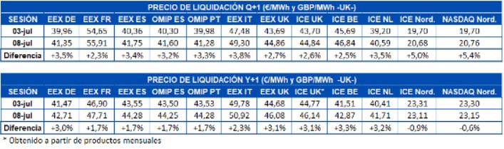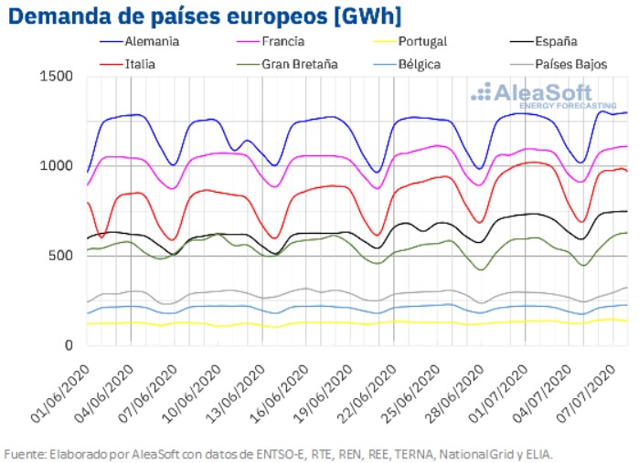 La demanda eléctrica aumentó en todos los mercados europeos analizados, excepto en Italia, del 6 al 8 de julio respecto a los mismos días de la semana del 29 de junio. La caída en Italia fue del 0,9% debido principalmente a temperaturas que fueron 1,5 °C menos cálidas. Los ascensos más notables son los de Portugal y Gran Bretaña, de un 7,6% y 4,5% respectivamente. En los Países Bajos y Francia los incrementos fueron del 2,3% y 2,1% respectivamente, mientras que en Alemania y Bélgica se registró un aumento del 1,6% en ambos casos.