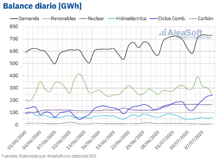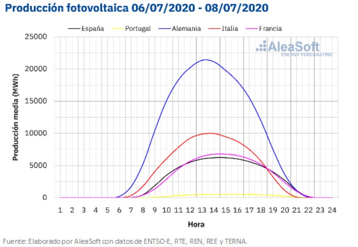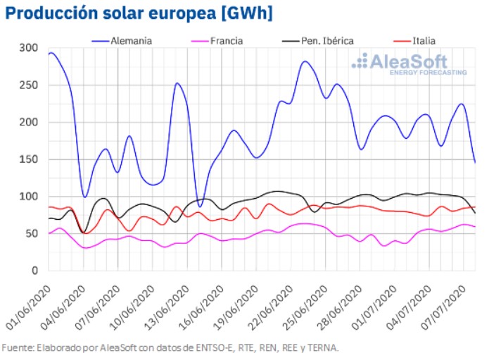 La producción solar aumentó un 30% en el mercado francés y un 3,6% en el italiano entre los días 6 y 8 de julio en comparación con el promedio de la semana del 29 de junio. Por el contrario, en la península ibérica y en Alemania se registraron descensos del 9,2% y del 1,7% respectivamente.