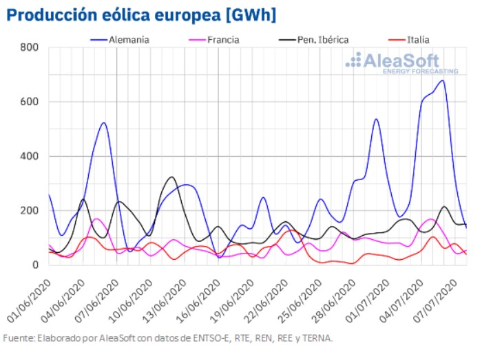 Del 1 al 8 de julio la producción eólica aumentó un 94% en el mercado italiano y un 84% en el mercado francés en comparación con el mismo período de julio de 2019. En la península ibérica y en el mercado alemán los incrementos fueron del 36% y el 11% respectivamente.