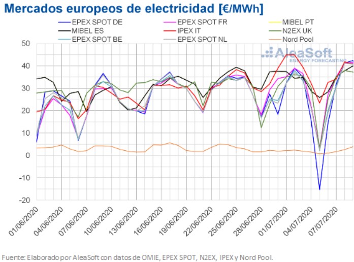 La semana del 6 de julio inició con niveles elevados de producción eólica que permitieron alcanzar el lunes los precios horarios negativos de algunos mercados eléctricos europeos. En el caso de los países nórdicos, además, la alta producción hidroeléctrica debida al deshielo también contribuyó a los precios bajos alcanzados. Pero el progresivo descenso de la producción eólica durante los siguientes días favoreció la tendencia ascendente de los precios de los mercados eléctricos europeos. Otro factor que propició el aumento de los precios fue el aumento de la demanda eléctrica.