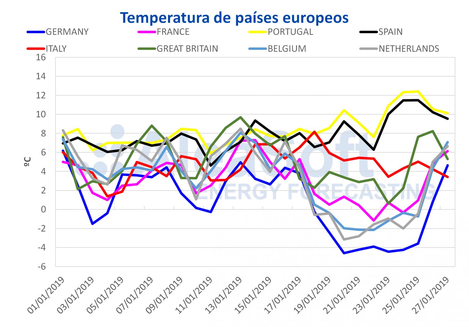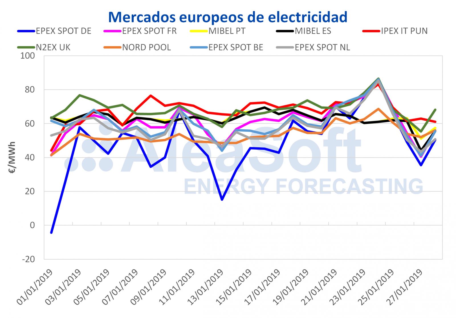 Desde principios de enero los precios medios de los principales mercados europeos han estado en torno a los 60 €/MWh. Los valores más altos se alcanzaron el 24 de enero cuando casi todos los mercados superaron los 80 €/MWh (EPEX SPOT Alemania, Francia, Bélgica, Holanda, IPEX Italia, N2EX UK). Los mercados MIBEL España y Portugal se mantuvieron sobre los 60 €/MWh por la alta producción eólica. El Nord Pool de los países nórdicos llegó a los 69 €/MWh el 24 de enero.