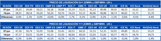 Los precios de los futuros de electricidad europeos para el tercer trimestre de 2019 finalizaron la semana pasada el viernes 14 de junio con una caída respecto a la sesión del viernes 7 de junio en la mayoría de los mercados, exceptuando el mercado EEX de España y los mercados OMIP de España y Portugal que se mantuvieron prácticamente invariables. Se destacan los mercados de los países nórdicos en ICE y NASDAQ para los cuales la disminución fue cercana al 4,5%. Los mercados EEX de Francia e Italia así como el mercado ICE de Bélgica cerraron cerca de un 2,0% más bajos que la semana anterior. Para el resto de los mercados la bajada se encuentra entre 0,1% y 0,9%.