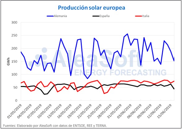 Durante la semana pasada la producción solar, que comprende las tecnologías fotovoltaica y termosolar, sufrió una caída del 16% en Alemania y del 3% en Italia, mientras que en España se recuperó un 0,3%. En AleaSoft se espera que en la semana actual la producción solar aumente fundamentalmente en Alemania, y en menor medida en España e Italia.