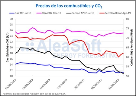 Los precios de los futuros del carbón API 2 en el mercado ICE para el mes de julio de 2019 aumentaron a principios de la semana pasada hasta los 55,50 $/t el lunes 10 de junio, pero continuaron con la tendencia a la baja y cerraron el viernes 14 de junio en 51,25 $/t, el valor más bajo de los últimos dos años. Este mercado se ha visto influenciado por los precios más competitivos del gas y el exceso de oferta mundial.