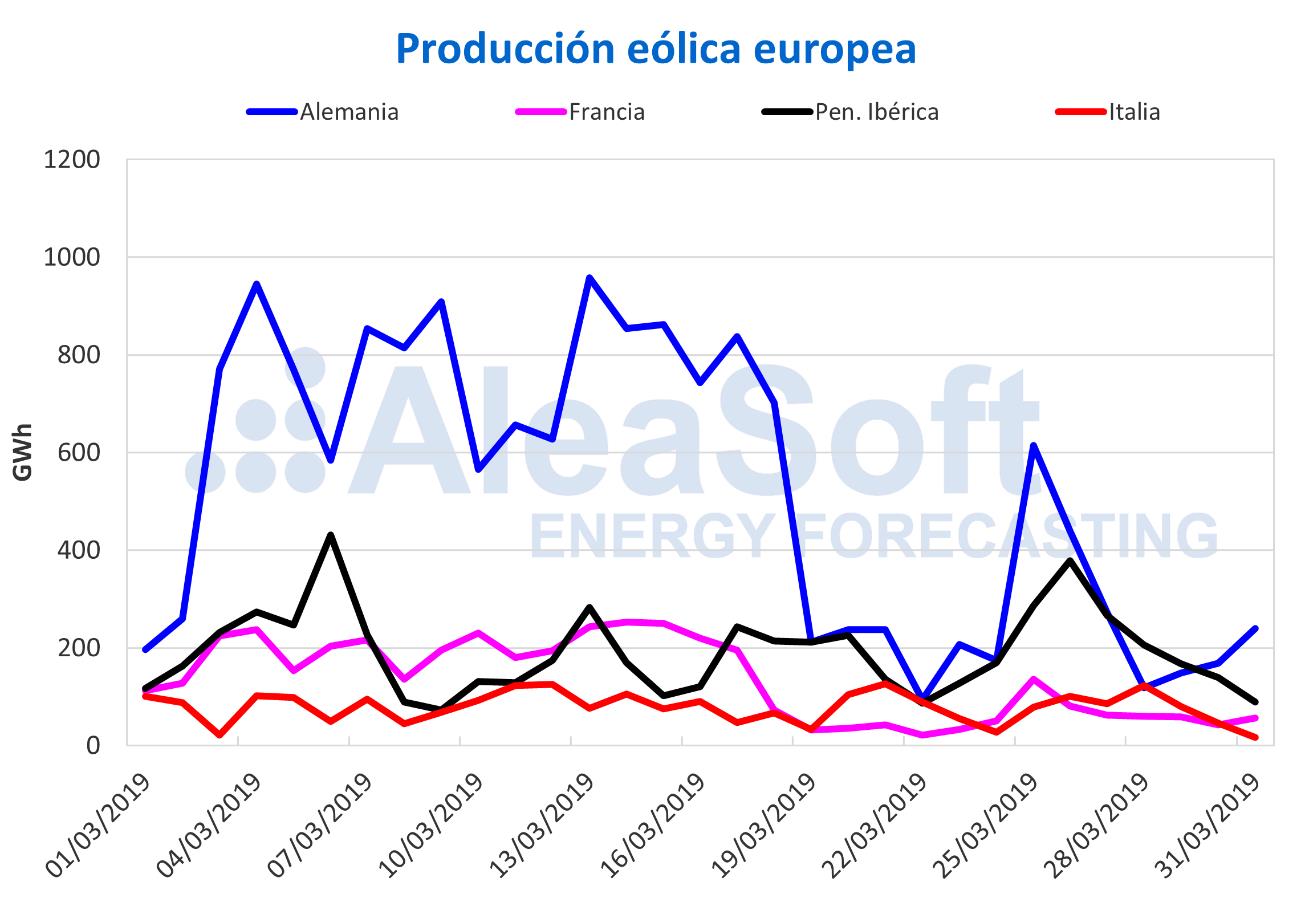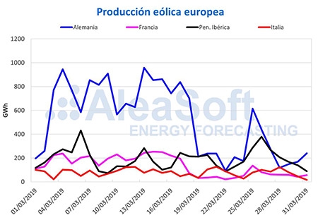 Durante el mes de marzo la producción eólica tuvo un considerable aumento con respecto a febrero. La subida fue del 30% en el global de los mercados europeos. Respecto al mes de marzo de 2018, en Francia y Alemania el aumento de la producción eólica ha sido del 50%, mientras que en la Península Ibérica se ha registrado una caída del 39% ya que en el mes de marzo del año pasado se alcanzó el récord histórico de producción eólica mensual en España con más de 7,5 TWh.