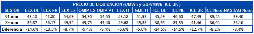 Haciendo un análisis comparativo del mes de marzo con respecto a febrero de este año, en todos los mercados europeos los precios spot han bajado una media de un 15% debido a una disminución de la demanda media, producida por un aumento promedio de la temperatura de unos 2 °C que se corresponde con el inicio de la primavera, y también a la caída de los precios del gas y el carbón. La producción renovable ha influido de forma notable en la disminución de los precios de marzo con aumento de la producción eólica del 30% y de la solar del 29% en el conjunto de los principales mercados europeos.