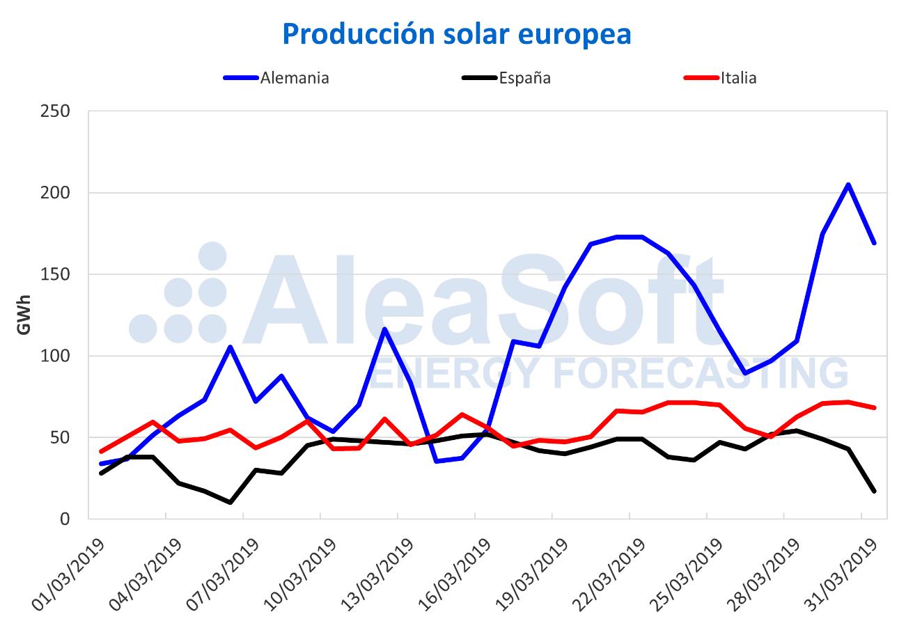 En el caso de la producción solar, que incluye tanto la tecnología fotovoltaica como la termosolar, el aumento respecto al mes de febrero fue de cerca del 30% en cada uno de los principales productores: Alemania, Italia y España. Con mayor cantidad de horas de sol cada mes hasta el verano la producción solar seguirá en aumento.