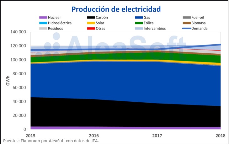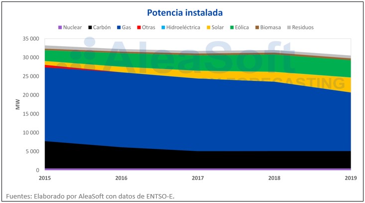 Paralelamente, el peso de las energías renovables como la fotovoltaica y la eólica ha ido aumentando año tras año. La mayor contribución es la correspondiente a la eólica que, en 2019, cuenta con una potencia instalada de 4626 MW, lo que representa una contribución similar a la del carbón. Por su parte, la capacidad instalada de energía solar en 2015 representaba tan solo un 3% del total, pero ha ido aumentando hasta situarse en un 13% en 2019. En los últimos años, casi se ha cuadruplicado, pasando de los 1000 MW instalados en 2015 a los 3937 MW de 2019.