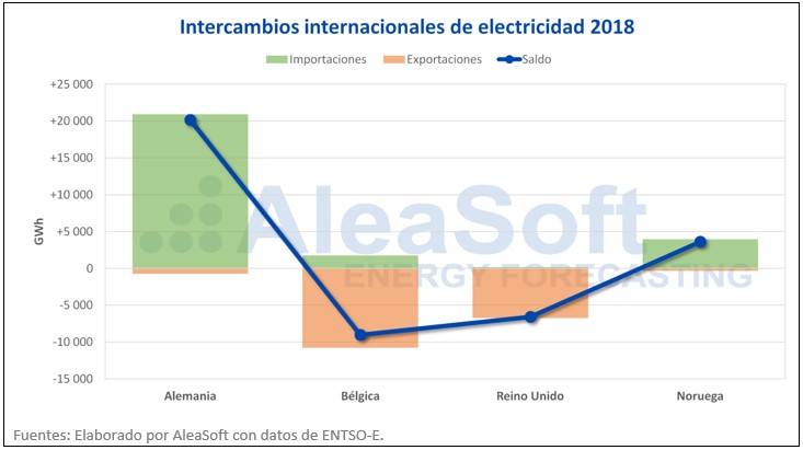 En el año 2018, los Países Bajos importaron 8223 GWh más de electricidad de la que exportaron a otros países. De los 26 818 GWh que se importaron en total, el 78% provenía de Alemania. Por otro lado, los Países Bajos exportaron un total de 18 596 GWh durante el año 2018. El país al que más energía eléctrica se exportó fue Bélgica, con un 58% del total, seguido del Reino Unido, con un 36%. En este año también se produjeron intercambios de electricidad con Noruega, pero con volúmenes menores.