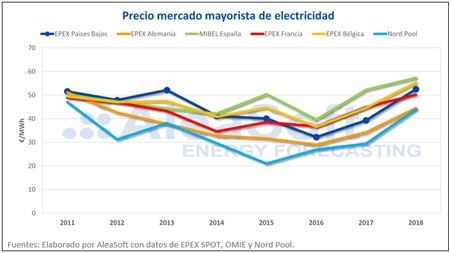 Los precios en el mercado mayorista de electricidad EPEX SPOT de los Países Bajos entre los años 2011 y 2013 fluctuaron en torno a los 50 €/MWh. Pero, luego descendieron desde el año 2013 hasta el año 2016, cuando se alcanzó un valor mínimo para el precio medio anual de 32,25 €/MWh. A partir del año 2016, los precios se han ido incrementando, siguiendo la misma tendencia que en otros mercados europeos como en Francia y Alemania. En el año 2018, se alcanzó un precio medio anual de 52,53 €/MWh, 20,28 €/MWh por encima del valor correspondiente al año 2016, lo que representa un aumento de un 62,9% y se sitúa ya 0,43 €/MWh por encima del precio medio en 2013.