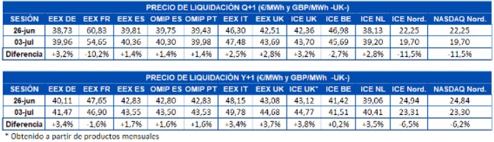 En cuanto a los precios diarios, los más bajos de la semana pasada se alcanzaron el domingo 5 de julio. Ese día los elevados niveles de producción eólica, combinados con el descenso de demanda del fin de semana, permitieron que los precios se desplomasen en la mayoría de los mercados europeos. En el mercado alemán se alcanzó un precio diario negativo de 15,34 €/MWh, el más bajo desde finales de mayo. En el mercado Nord Pool, el precio diario fue de 0,72 €/MWh, el más bajo en este mercado al menos desde el 2011. En este mercado, además de la producción eólica, la producción hidroeléctrica también fue elevada debido al deshielo. Otros mercados con los precios diarios bajos fueron los mercados N2EX y EPEX SPOT de Francia, Países Bajos y Bélgica, con precios de 2,95 €/MWh, 3,19 €/MWh, 2,39 €/MWh y 2,14 €/MWh respectivamente. En cambio, en los mercados IPEX y MIBEL, pese al descenso, los precios fueron superiores a los 20 €/MWh, concretamente de 25,86 €/MWh en el mercado MIBEL y de 23,39 €/MWh en el mercado IPEX.