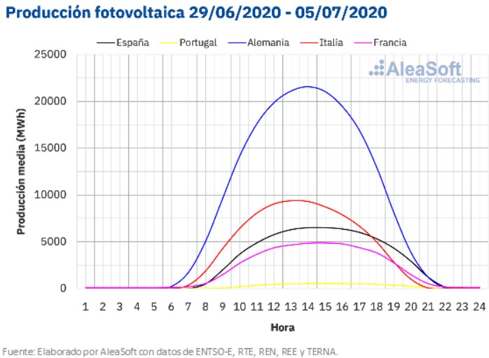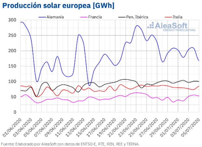 La semana del 29 de junio al 5 de julio, la producción solar disminuyó en los mercados de Alemania, Francia e Italia en comparación con la semana del 22 de junio. En el mercado alemán la reducción de la producción fue de un 18% mientras que en el francés y el italiano de un 15% y un 4,6% respectivamente. Por el contrario, en los mercados de la península ibérica la producción aumentó, un 7,2% en el portugués y un 5,4% en el español.