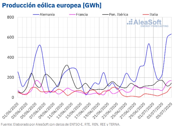 La semana de final de junio e inicio de julio, concluyó con un aumento generalizado de la producción eólica en comparación con la cuarta semana de junio. En el mercado alemán aumentó más del doble de lo que se había producido la semana anterior, mientras que en el francés la producción creció cerca de un 47%. En el resto de los mercados la producción con esta tecnología aumentó entre un 13% y un 14%.