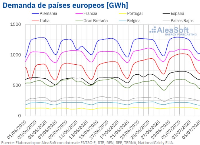 La demanda eléctrica se incrementó en la mayoría de los mercados durante la semana del 29 de junio respecto a la cuarta semana de junio. En España e Italia continuó recuperándose por tercera y cuarta semana consecutiva respectivamente, registrando ascensos del 6,3% y 7,0% en ese orden. Uno de los factores influyentes en la subida de España fue el efecto del festivo del 24 de junio en algunas regiones, que al corregirse resulta en un aumento del 5,4%. Otros de los ascensos registrados en la demanda fueron del 3,4% en Gran Bretaña, del 1,6% en Portugal y del 1,4% en Alemania. En Bélgica, Países Bajos y Francia hubo descensos del 2,7%, 2,2% y 0,3% respectivamente.