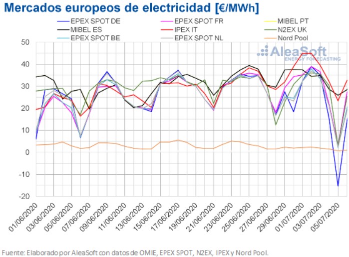 Por otra parte, durante la semana analizada se alcanzaron precios horarios negativos en algunos mercados europeos. El lunes 29 de junio, los mercados británico e irlandés presentaron precios horarios negativos, siendo en ambos mercados el más bajo durante la hora 6, de 19,56 €/MWh y 20,00 €/MWh respectivamente. Mientras que el martes 30 de junio fue en Dinamarca donde se alcanzó un precio horario negativo. El sábado 4 de julio el mercado alemán y el danés tuvieron precios horarios negativos, en la hora 14. El domingo 5 de julio se alcanzaron precios horarios negativos en Alemania, Austria, Bélgica, Dinamarca, Francia, Gran Bretaña, Irlanda, los Países Bajos y Suiza. Mientras que, el lunes 6 de julio, los mercados con precios horarios negativos fueron los de Bélgica, Dinamarca, Finlandia, Gran Bretaña, Irlanda, los Países Bajos y Suecia. Este día también hubo un precio horario negativo de 0,09 €/MWh en los mercados de Estonia, Letonia, Lituania y en tres zonas de Noruega. En estos últimos casos, fue la primera vez en alcanzarse precios inferiores a 0 €/MWh en estos mercados como mínimo desde el año 2013.