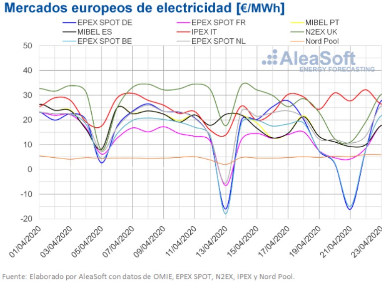 Los primeros cuatro días de esta semana del 20 de abril, los precios descendieron en la mayoría de los mercados eléctricos europeos respecto a los registrados los mismos días de la semana pasada. Los mayores descensos, del 56% y del 54%, se produjeron en los mercados EPEX SPOT de Alemania y Bélgica, respectivamente. Mientras que en el mercado EPEX SPOT de los Países Bajos se produjo la menor bajada de precios, del 0,6%. Por otra parte, los mercados IPEX de Italia, Nord Pool de los países nórdicos y EPEX SPOT de Francia presentaron aumentos de precios del 42%, 40% y 8,0%, respectivamente.