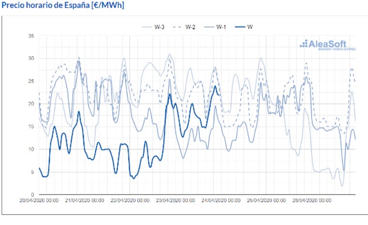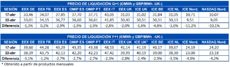 En la mayoría de los mercados el comportamiento de los precios en lo que va de esta semana fue decreciente hasta la sesión del martes 21 de abril. Este día se registraron los precios más bajos, que estuvieron relacionados con la caída de los precios del petróleo Brent y del gas. En la sesión del miércoles 22 los precios se recuperaron después de que EDF extendiera las paradas por mantenimiento en sus reactores nucleares por las incertidumbres relacionadas con la crisis sanitaria de la COVID-19. No obstante, en la mayoría de los casos, los precios de cierre continuaron estando por debajo de los de la sesión del viernes 17 de abril.