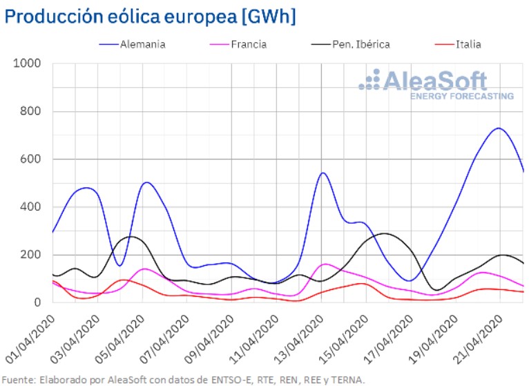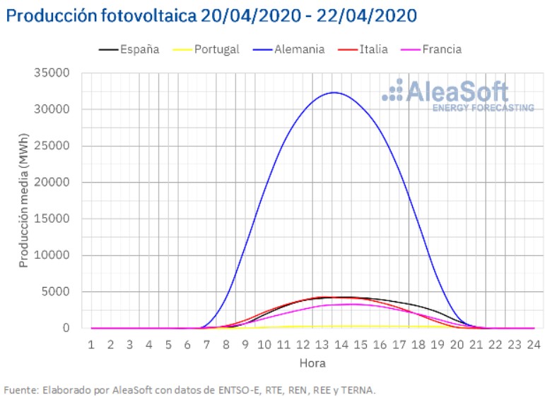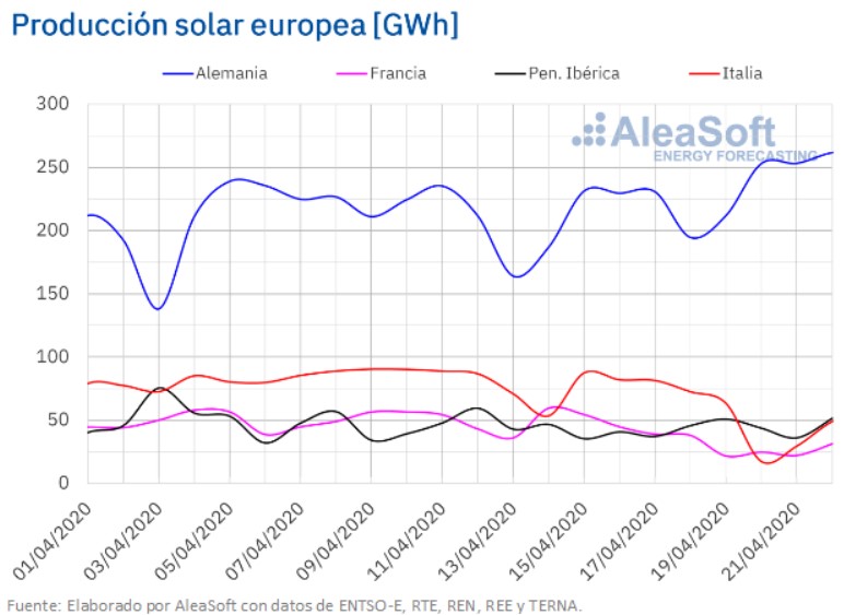 La producción solar en Alemania aumentó un 24% durante los tres primeros días de esta semana en comparación con el promedio de la semana pasada que concluyó el pasado domingo 19 de abril. De hecho, la producción total de ayer 22 de abril, de 262 GWh, ha sido la más alta de lo que llevamos de año. En la península ibérica el promedio de los tres primeros días de esta semana también fue mayor que el promedio de la semana pasada, en este caso un 2,3%, a pesar de la disminución del 14% en el mercado portugués. En los mercados italiano y francés las producciones fueron un 56% y un 38%, respectivamente, más bajas que el promedio de la semana pasada.