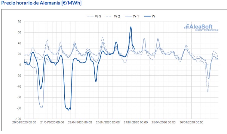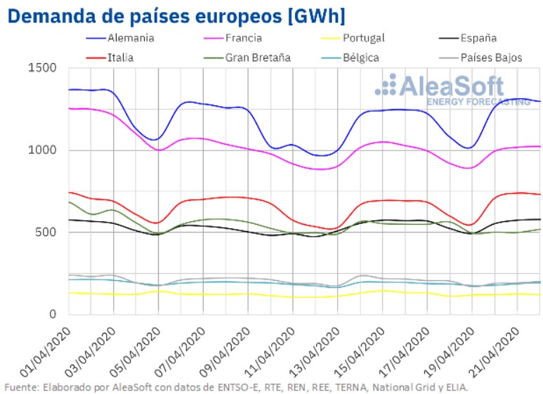 Por otra parte, los tres primeros días de esta semana se registraron precios horarios negativos en los mercados de EPEX SPOT de Alemania, Bélgica y Francia. Además, el lunes y el martes, también hubo precios horarios negativos en Gran Bretaña. No obstante, en los primeros cuatro días de esta semana, sólo se alcanzaron precios promedios diarios negativos en los mercados EPEX SPOT de Alemania y Bélgica, de 16,15 €/MWh y 14,99 €/MWh, respectivamente, para el martes 21 de abril. En el caso del mercado alemán, el día 21 de abril en la hora 15, se registró un precio horario de 83,94 €/MWh, que es el más bajo desde junio de 2019.