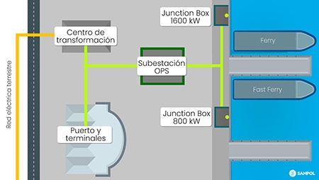 Para la conexión eléctrica a tierra de los buques, Sampol ha ejecutado en el Puerto de Palma una subestación OPS (Offshore Power Supply), también denominada Cold Ironing, que suministrará electricidad a los buques amarrados en el muelle de Paraires a través de dos acometidas denominadas Junction Box. Una para buques categoría ferry en media tensión y la otra para la categoría fast ferris, en baja tensión.