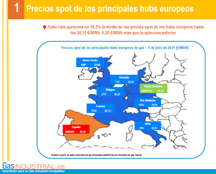 El último boletín de precios de mercados de GasIndustrial, correspondiente al periodo del 16 de junio de 2021 al 9 de julio, señala que el precio del gas alcanza niveles máximos, subiendo un 18,3% la media de los precios spot de los hubs europeos hasta los 34,31 €/MWh, 5,28 €/MWh más que la quincena anterior.