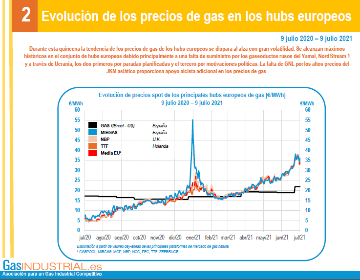 Durante esta quincena la tendencia de los precios de gas de los hubs europeos se disparan al alza con gran volatilidad. Se alcanzan máximos históricos en el conjunto de hubs europeos debido principalmente a una falta de suministro por los gaseoductos rusos del Yamal, Nord Stream 1 y a través de Ucrania, los dos primeros por paradas planificadas y el tercero por motivaciones políticas. La falta de GNL por los altos precios del JKM asiático proporciona apoyo alcista adicional en los precios de gas.