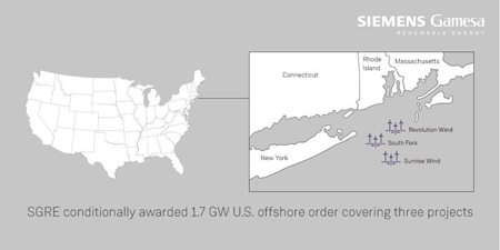 Siemens Gamesa Renewable Energy (SGRE) ha cerrado un pedido condicional de 1.714 MW offshore en Estados Unidos con la joint venture formada por el grupo energético danés Ørsted y el proveedor de energía estadounidense Eversource. El contrato, sujeto a la decisión final de inversión de Ørsted y Eversource, es el de mayor envergadura firmado hasta la fecha en el mercado offshore de Estados Unidos. Incluye el suministro e instalación de aerogeneradores del modelo SG 8.0-167 DD en tres parques eólicos ubicados en la costa noreste del país, así como servicios de operación y mantenimiento.