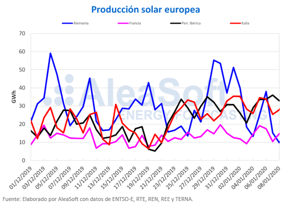 La producción solar media de los mercados de Europa disminuyó en la mayoría de los mercados entre el lunes y miércoles de esta semana respecto a la semana pasada, con la excepción de la península ibérica. En Portugal el promedio de producción solar se ha mantenido creciendo paulatinamente desde hace dos semanas y en esta ha estado un 21% por encima de la anterior. Con un crecimiento similar, la generación con esta tecnología en España durante los tres primeros días de la semana superó en un 21% a la de la semana del 30 de diciembre. Mientras, en Alemania e Italia los descensos fueron de un 38% y un 6,5%, respectivamente.