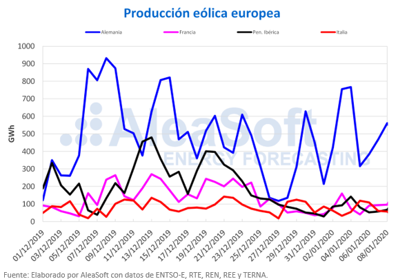 En cuanto al nivel medio de la producción eólica, la mayoría de los mercados europeos sufrieron bajadas entre el 6 y el 8 de enero respecto a la primera semana del año. Uno de los mercados donde se recuperó fue el francés, donde aumentó en un 36%. La producción media del mercado italiano se mantuvo en el rango de los 74 GWh a 77 GWh al igual que en las últimas dos semanas, incrementándose en un 2,4% durante los días transcurridos de esta semana. En España y Portugal, la generación retrocedió en este período, como viene sucediendo desde hace tres semanas, decreciendo en un 45% y un 17% respectivamente.