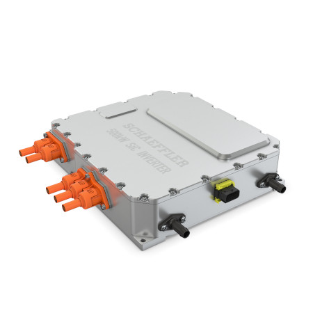 Como novedad, Schaeffler presenta un sistema propio de electrónica de potencia de 800 voltios para aplicaciones de ejes eléctricos en vehículos de alto rendimiento. Esta solución escalable permite obtener una potencia continua de hasta 330 kW y una potencia máxima a corto plazo de hasta 500 kW. La densidad de potencia que se puede alcanzar, de hasta 70 kW por litro, denota unas dimensiones reducidas de la carcasa, y, en consecuencia, ventajas en la integración. La electrónica de potencia contribuye decisivamente, junto con el motor, a la eficiencia del accionamiento. Schaeffler ha optado por utilizar la última tecnología de banda ancha de carburo de silicio en la fuente de alimentación de 800 voltios, lo que reducirá significativamente las pérdidas de energía en comparación con la tecnología IGBT de silicio convencional y permitirá eficiencias de más del 99% en rangos de carga definidos. Como resultado, la autonomía general de los vehículos eléctricos aumentará notablemente. Además, las velocidades de carga que se pueden alcanzar con el sistema de 800 voltios son considerablemente superiores a las que se consiguen con el sistema de 400 voltios que se ha utilizado ampliamente hasta ahora. También se utiliza una solución propia de monitorización de los motores, que permite diversos procesos de modulación y frecuencias de conmutación variables.