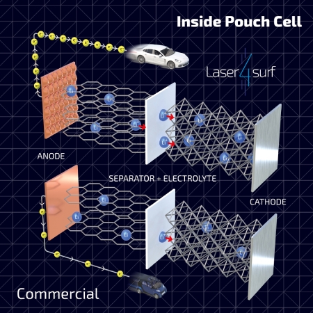El trabajo integral realizado en el marco de Laser4Surf ha permitido confirmar que la nano estructuración da como resultado una capacidad de carga-descarga mejorada para todos los electrodos y configuraciones de celda. De hecho, las baterías pueden cargarse y descargarse más rápido mientras mantienen densidades de corriente más altas.