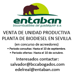 En cumplimiento del plan de liquidación aprobado por el Juzgado de lo Mercantil nº 2 de Sevilla, proc. nº 1036/2013, dentro de la primera fase de dicho plan, se ha iniciado el proceso de venta de la Unidad Productiva de BIODIESEL, en funcionamiento en la actualidad, a partir de Aceites de segunda mano y otros productos, situada en Sevilla en la Carretera del Copero s/n. Durante esta fase de venta de la unidad productiva, los interesados podrán acceder a información del estado de la Unidad Productiva y sus resultados de producción para, posteriormente, proceder a presentar una oferta de compra por la Unidad Productiva ante Notario y en sobre cerrado.