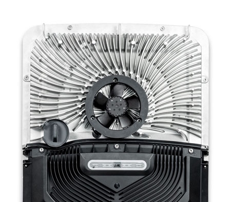 El resultado es un sistema de ventilación altamente eficiente que consiste en un disipador de calor y un ventilador que refrigera la electrónica de potencia en el interior del inversor. El corazón del sistema de ventilación consiste en una carcasa innovadora, donde se aloja integrado un disipador de calor de aluminio fundido a presión, que dispone de unos alerones especialmente dispuestos para su refrigeración.