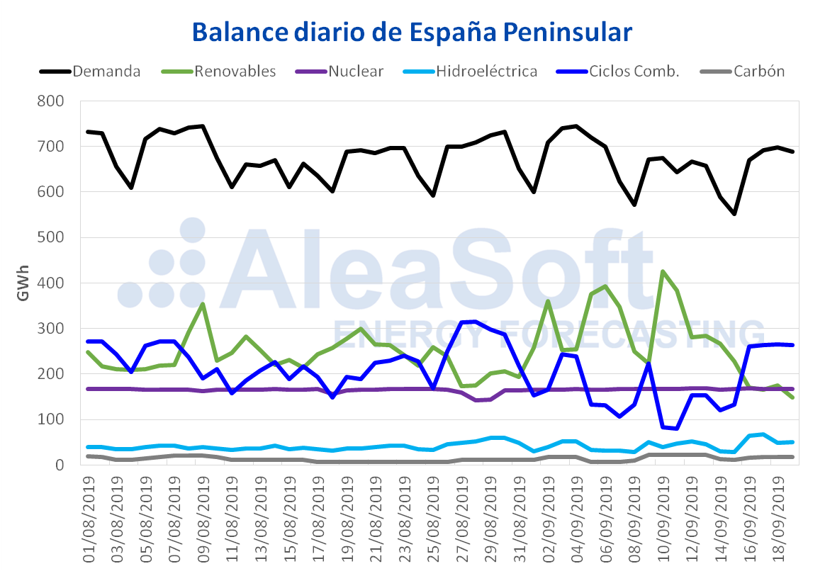 Los precios de los futuros de derechos de emisión de CO2 en el mercado EEX para el contrato de referencia de diciembre de 2019 comenzaron esta semana con un aumento en los precios, para posteriormente iniciar un descenso el martes. Así, el lunes 16 de septiembre se alcanzó un precio de 27,04 €/t, un 8,1% superior al lunes de la semana anterior. En cambio, el martes 17 de septiembre el precio disminuyó en un ââ?¬â??3,1% respecto al día anterior, hasta alcanzar un valor de 26,21 €/t. Esta caída en los precios continuó ayer, llegando a un precio de 25,45 €/t, un ââ?¬â??3,1% inferior al del miércoles de la semana pasada.