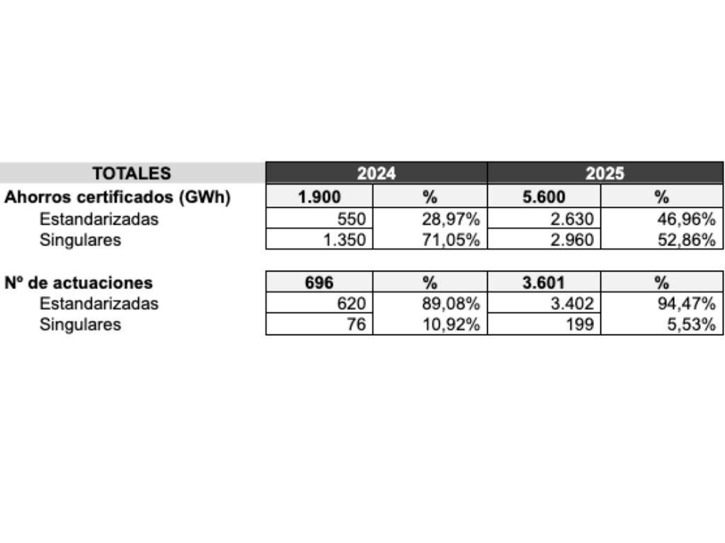 El ahorro certificado en 2025 ha sido de 5,6 TWh lo que supone haber multiplicado casi por 3 los 1,9 TWh de 2024, que ya fue un muy buen dato para el primer año de funcionamiento “real” del mercado. En cuanto al número de actuaciones, en 2024 se solicitaron 696 y en 2025 han sido 3.601, lo que pone de manifiesto el crecimiento exponencial del sistema.